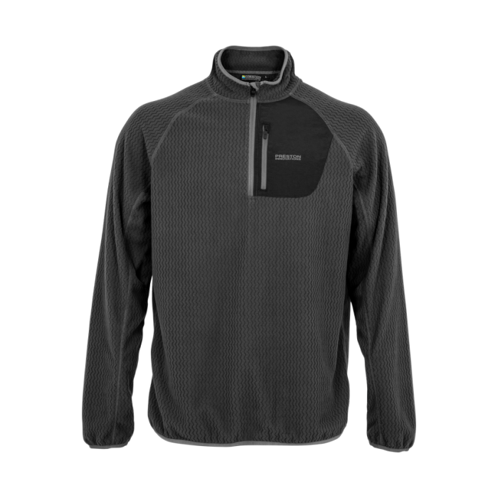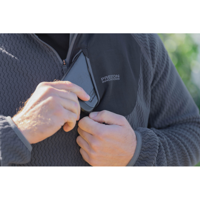 Un pile leggero ma caldo con zip a un quarto e finitura a nido d'ape. Dotato di tasca per il telefono sul petto e polsini elasticizzati. E' lo strato intermedio perfetto per le giornate più fresche.