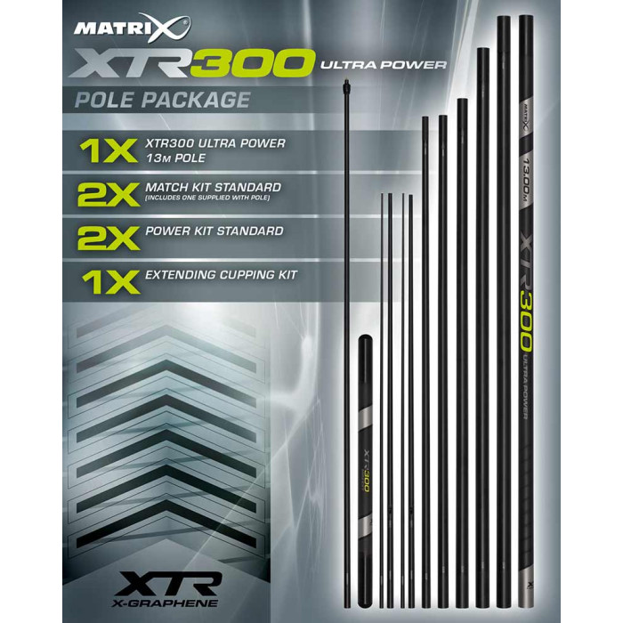 - Pacchetto XTR300 Ultra Power 13 m Roubaisienne XTR300 Ultra Power 13 m 2 kit da gara standard (di cui uno già fornito con la roubaisienne) 2 Power Kit standard 1 kit con coppetta di pasturazione estensibile Twist lock Set di coppette per la pasturazione 1 Mini estensione (adatta alla 13 m) Custodia XTR.